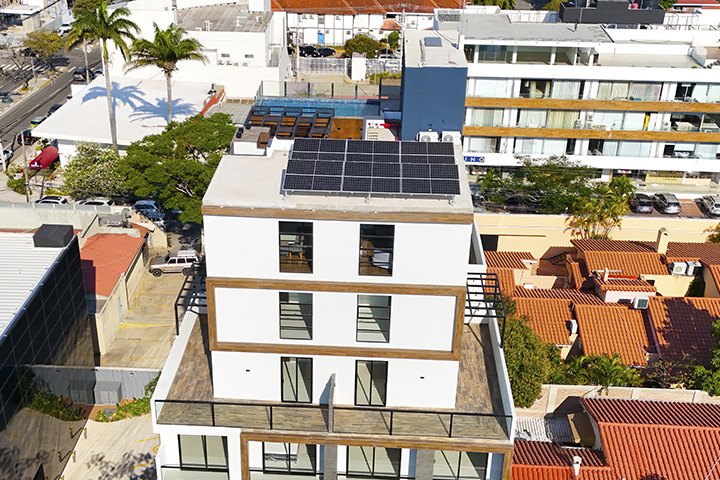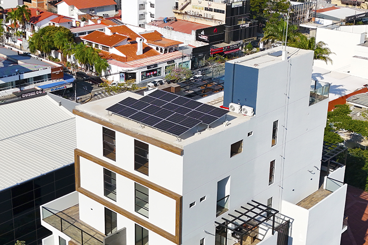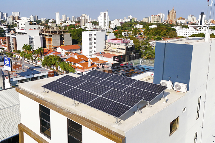 El sistema implementado para el Edificio Aura es un sistema On-Grid, compuesto por 12 paneles solares de la marca UKSOL con Tecnología Monocristalina Half – Cell de 550 W y un inversor de 8 kw de potencia.